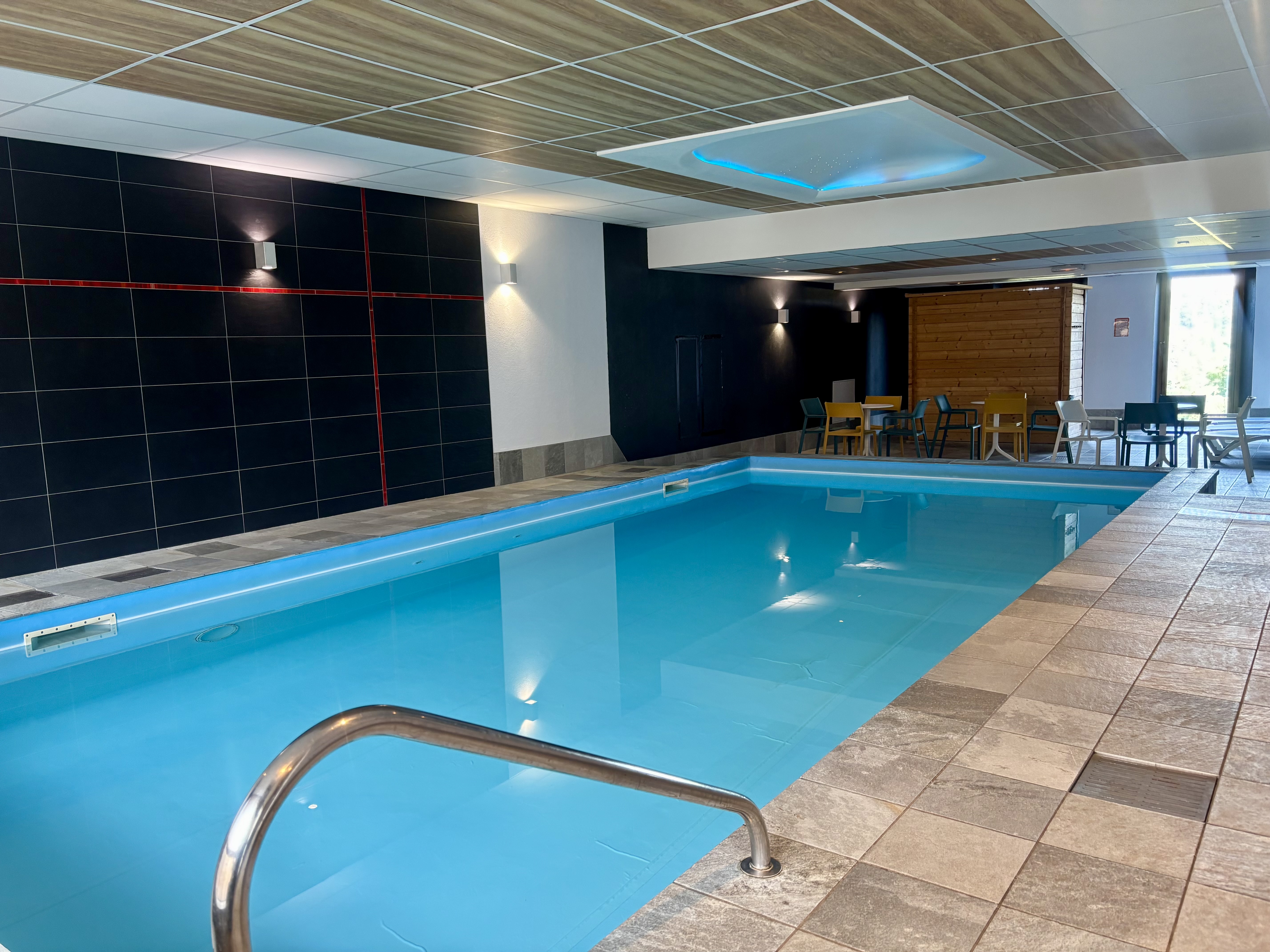 Oui, l'hôtel met à disposition de ses clients une piscine de 4m x 9m couverte et chauffée à 28°c. ainsi qu'un sauna, avec une prestation de massages en supplément. La piscine n'est pas accessible aux personnes à mobilité réduite.